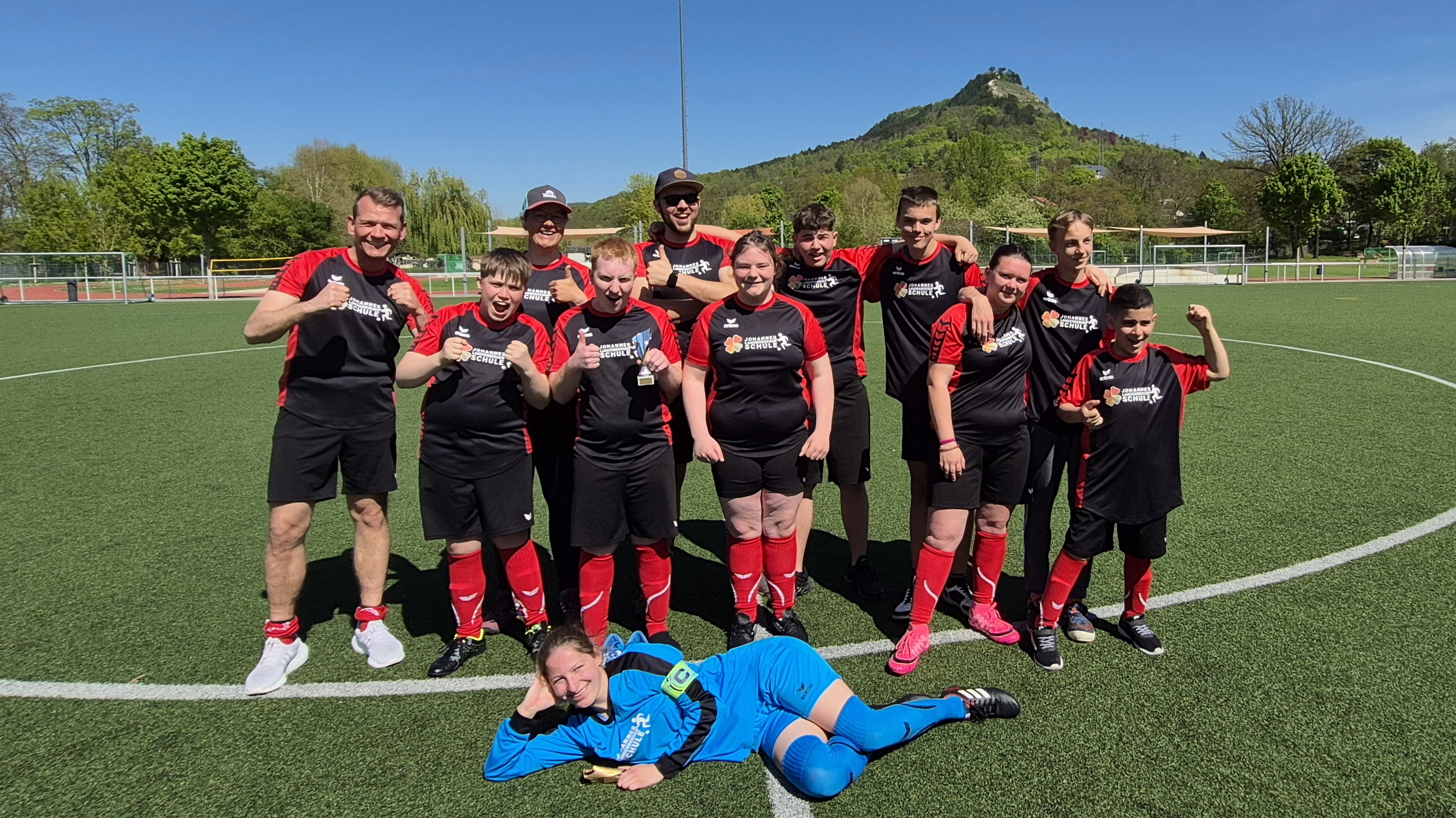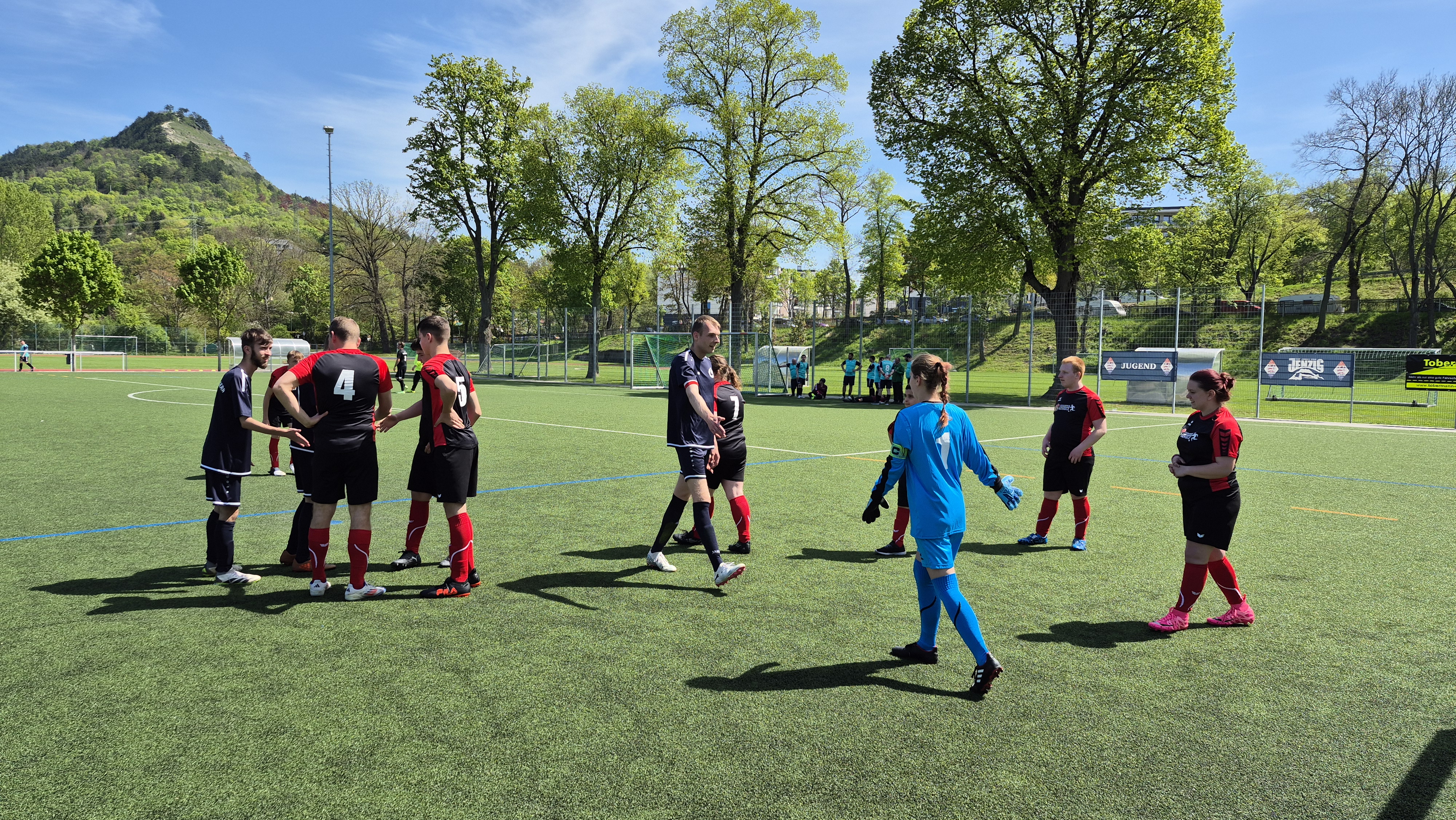 Am 28.04.2025 fuhren unsere Landenberger Fußballer*innen nach Jena zum ersten Inklusionsfußballspiel. 10 Mädels und Jungs spielten gemeinsam mit zwei Unified-Partnern in einem Team. Unified-Partner sind Sportler ohne geistige Beeinträchtigung. Das erste Spiel in der Klassifizierung konnte unsere Mannschaft mit einem 1:0 für sich entscheiden. Das zweite Spiel ging knapp mit einem 1:1 unentschieden aus. Am Ende der Klassifizierung gab es Punktegleichstand zwischen unserer Mannschaft und einer anderen. Somit ging es zum Neunmeterschießen. Alle behielten die Nerven und konnten am Ende das Schießen für sich entscheiden. Somit zogen Landenbergers für die Finalläufe in die erste Leistungsklasse ein. Nach einem stärkenden Mittagessen ging es dann wieder aufs Feld. Die Finalspiele hatten begonnen und unsere Mannschaft spielte stark. Wieder einmal bewiesen sie, dass sie zwar die Jüngsten aber keinesfalls die schlechtesten auf dem Platz sind. Am Ende mussten sie sich zwei sehr starken Mannschaften aus Werkstätten geschlagen geben. Der Pokal für den dritten Platz war ihnen sicher. Stolz und mit neuen Erfahrungen im Gepäck kehrten alle glücklich wieder nach Hause zurück.